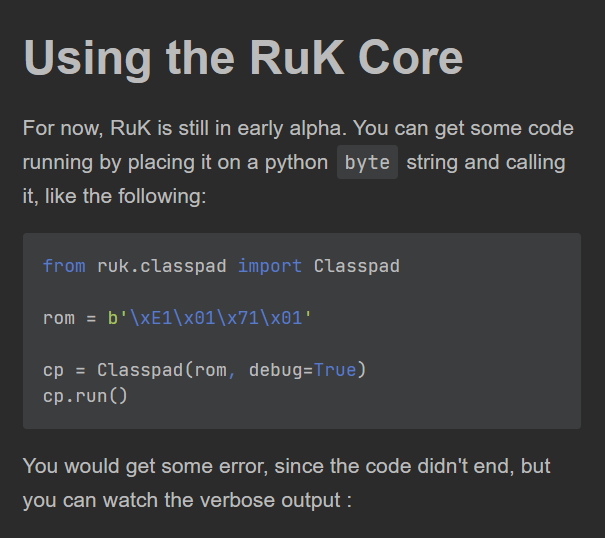 When working on some big project (that aren’t simply made as PoC) I try to make a documentation on how to use the code base and how to do common procedures. I wrote for now two files, one on how to use the “Core” responsible for handling raw binary and emulating it and another on how to add and edit the OPCodes.